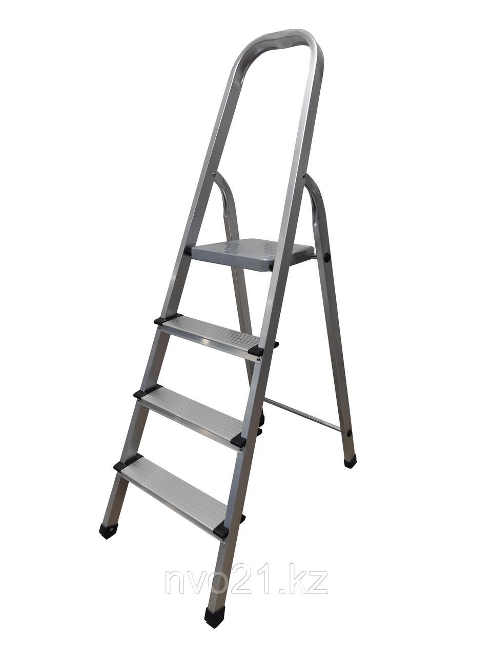 Алюминиевая стремянка может использоваться для проведения строительных, монтажных, ремонтных и других работ на высоте до 2,9 м. Переносная конструкция состоит из основной части со ступенями, опорной части и рабочей площадки. Дуга безопасности является продолжением стороны, по которой осуществляется подъем . Модель оснащена противоскользящими опорами из пластика и рифлеными ступенями, повышающими ее безопасность. Способна выдержать без деформации нагрузку в 150 кг.