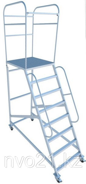 Лестница с площадкой типа ЛСА снабжена 4-мя (до 4000 мм до площадки – 2 поворотных колеса с тормозом, 2 – неповоротных без тормоза) колесами для перемещения и фиксации в определенном положении. Возможна установка винтовых опор или подпружиненных колёс. Площадка с ограждением предназначена для удобства и безопасности ведения работ на высоте и образования рабочего места непосредственно в зоне производства работ. Площадка имеет ограждение из труб, передняя сторона которого представляет собой подвижную перекладину, жестко закрепляемую фиксатором.